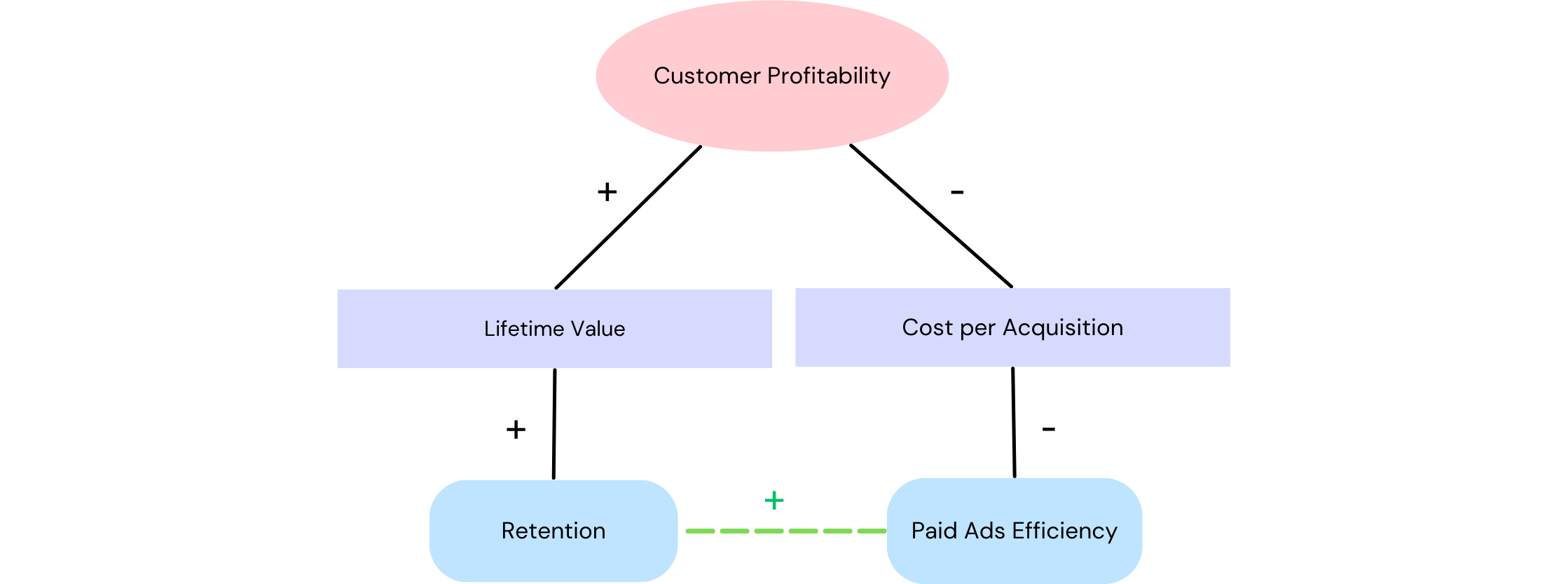 We've identified our two core metrics that influence customer profitability; customer lifetime value and customer acquisition costs. Take each of these core metrics, ask the same questions, and see what other causal relationships exist deeper into the system.